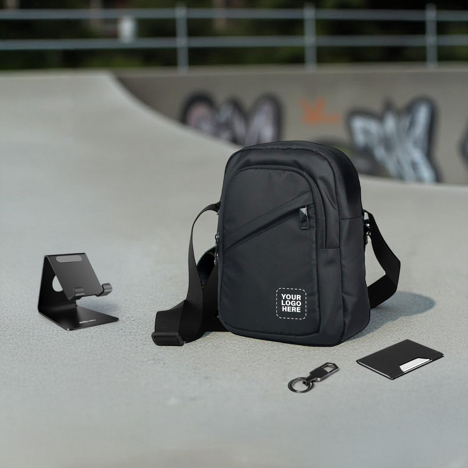 Smart Mobility Corporate Gift Set – Compact Crossbody Bag, Metal Mobile Stand, Keychain & Card Holder (Custom Branding)