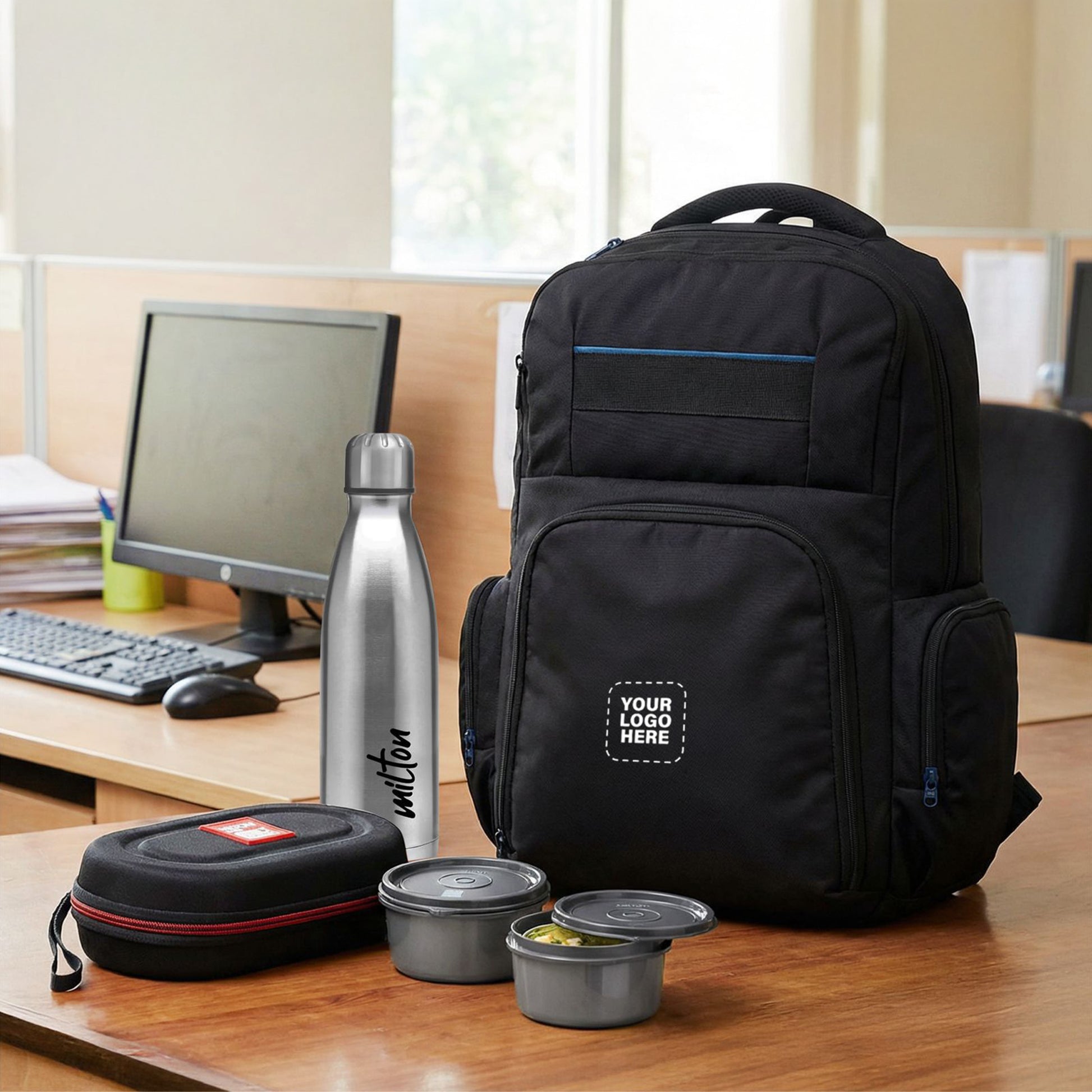 Corporate Daily Essentials Combo – Logo-Branded Backpack with Milton Bottle & Lunch Box Set